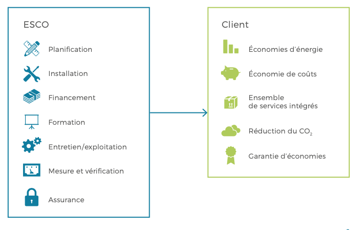 Dans la plupart des cas, le financement provient directement des économies réalisées, l’ESCO prend ainsi à sa charge le risque de ne pas faire d’économies d’énergie.